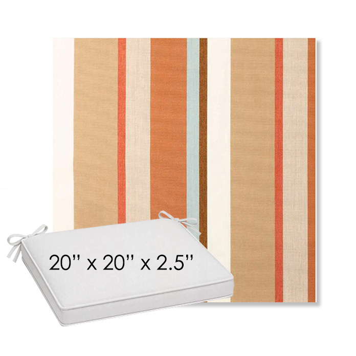 20" x 20" x 2.5" Thick outdoor dining chair seat cushion designed for a simple, ready-to-order fit. Features a boxed construction with piping, fabric ties, and zipper opening. Made in 700+ Sunbrella® fabrics for long-lasting outdoor performance.