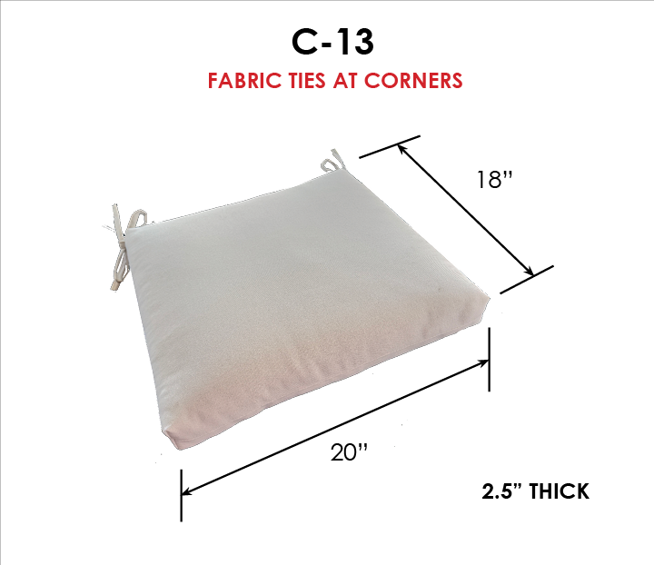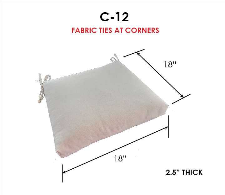 Looking for larger quantities for your commercial property, HOA, Hotel, Country Club, Swim Club or Apartment Complex. Universal outdoor dining chair seat cushion in Sunbrella Fabrics- Solution dyed acrylics with a 5 year warranty. Available in 4 universal sizes with generous fabric ties and outdoor foam with polyester fiber fill—perfect for most patio dining chairs. Simple Center Seam Design. Each cushion is approximate 2.5" Thick. Buy more and save on matching seat cushions for your outdoor space. All patio dining chair cushions are custom made to order in the size and fabric of your choice.