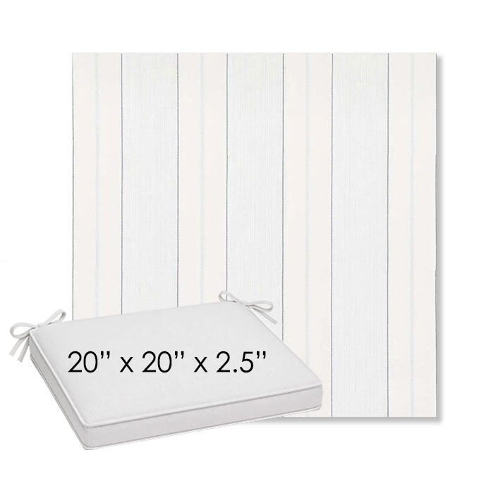 20" x 20" x 2.5" Thick outdoor dining chair seat cushion designed for a simple, ready-to-order fit. Features a boxed construction with piping, fabric ties, and zipper opening. Made in 700+ Sunbrella® fabrics for long-lasting outdoor performance.