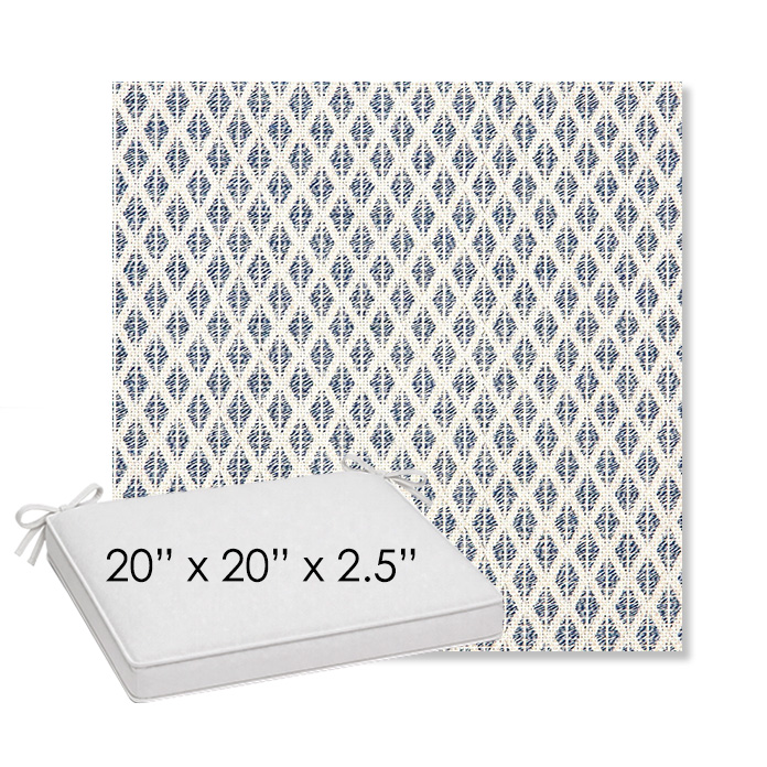 20" x 20" x 2.5" Thick outdoor dining chair seat cushion designed for a simple, ready-to-order fit. Features a boxed construction with piping, fabric ties, and zipper opening. Made in 700+ Sunbrella® fabrics for long-lasting outdoor performance.