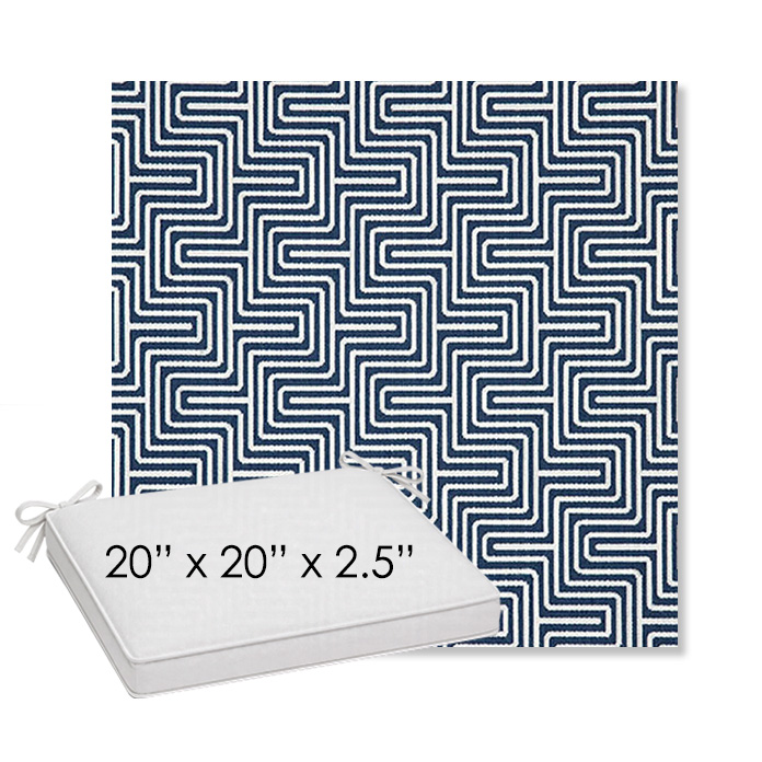 20" x 20" x 2.5" Thick outdoor dining chair seat cushion designed for a simple, ready-to-order fit. Features a boxed construction with piping, fabric ties, and zipper opening. Made in 700+ Sunbrella® fabrics for long-lasting outdoor performance.