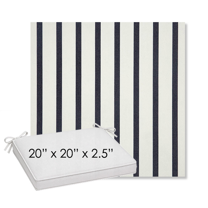 20" x 20" x 2.5" Thick outdoor dining chair seat cushion designed for a simple, ready-to-order fit. Features a boxed construction with piping, fabric ties, and zipper opening. Made in 700+ Sunbrella® fabrics for long-lasting outdoor performance.