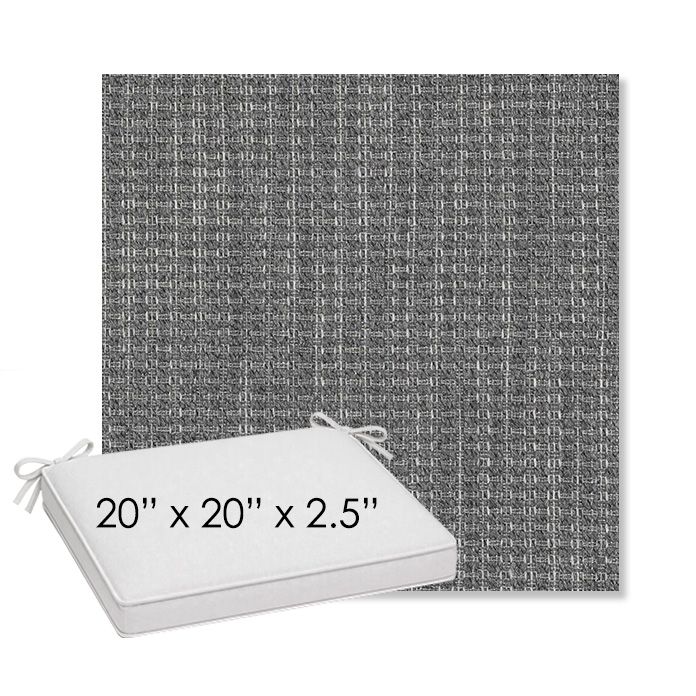 20" x 20" x 2.5" Thick outdoor dining chair seat cushion designed for a simple, ready-to-order fit. Features a boxed construction with piping, fabric ties, and zipper opening. Made in 700+ Sunbrella® fabrics for long-lasting outdoor performance.