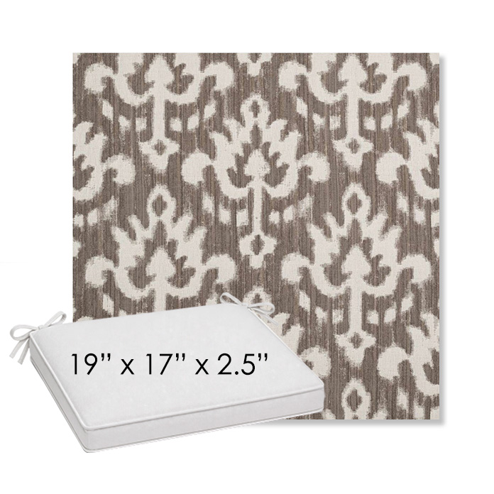 19" x 17" x 2.5" Thick outdoor dining chair seat cushion designed for a simple, ready-to-order fit. Features a boxed construction with piping, fabric ties, and zipper opening. Made in 700+ Sunbrella® fabrics for long-lasting outdoor performance.