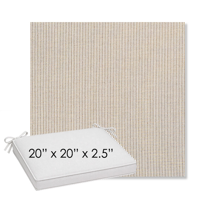 20" x 20" x 2.5" Thick outdoor dining chair seat cushion designed for a simple, ready-to-order fit. Features a boxed construction with piping, fabric ties, and zipper opening. Made in 700+ Sunbrella® fabrics for long-lasting outdoor performance.