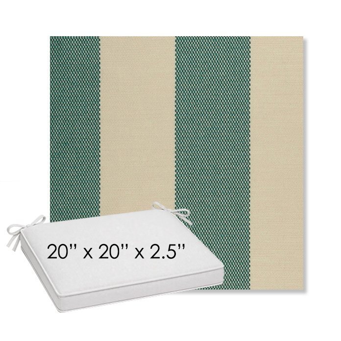 20" x 20" x 2.5" Thick outdoor dining chair seat cushion designed for a simple, ready-to-order fit. Features a boxed construction with piping, fabric ties, and zipper opening. Made in 700+ Sunbrella® fabrics for long-lasting outdoor performance.