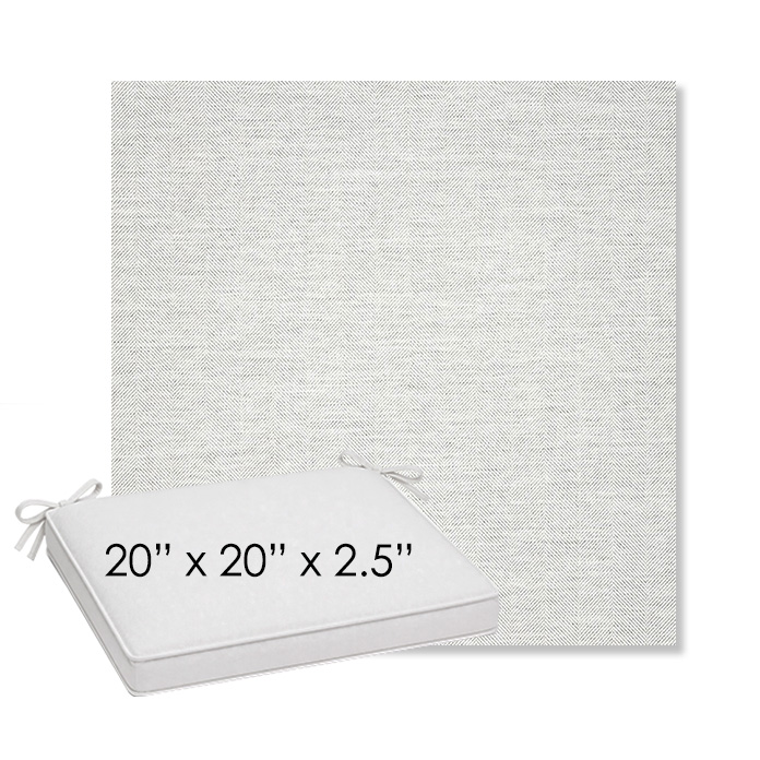 20" x 20" x 2.5" Thick outdoor dining chair seat cushion designed for a simple, ready-to-order fit. Features a boxed construction with piping, fabric ties, and zipper opening. Made in 700+ Sunbrella® fabrics for long-lasting outdoor performance.