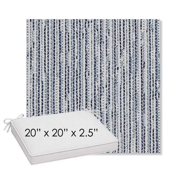 20" x 20" x 2.5" Thick outdoor dining chair seat cushion designed for a simple, ready-to-order fit. Features a boxed construction with piping, fabric ties, and zipper opening. Made in 700+ Sunbrella® fabrics for long-lasting outdoor performance.