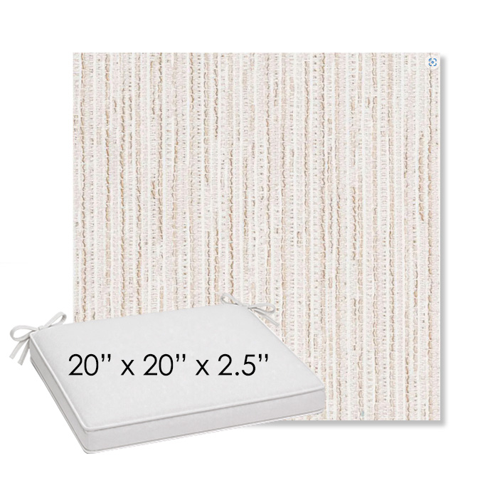 20" x 20" x 2.5" Thick outdoor dining chair seat cushion designed for a simple, ready-to-order fit. Features a boxed construction with piping, fabric ties, and zipper opening. Made in 700+ Sunbrella® fabrics for long-lasting outdoor performance.