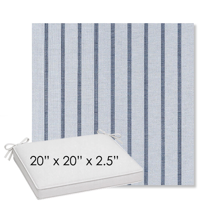20" x 20" x 2.5" Thick outdoor dining chair seat cushion designed for a simple, ready-to-order fit. Features a boxed construction with piping, fabric ties, and zipper opening. Made in 700+ Sunbrella® fabrics for long-lasting outdoor performance.