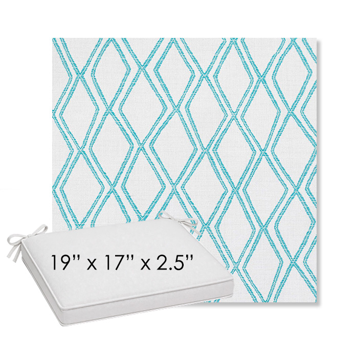 19" x 17" x 2.5" Thick outdoor dining chair seat cushion designed for a simple, ready-to-order fit. Features a boxed construction with piping, fabric ties, and zipper opening. Made in 700+ Sunbrella® fabrics for long-lasting outdoor performance.
