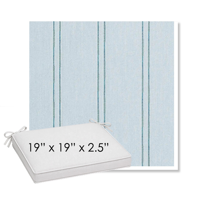 19" x 19" x 2.5" Thick outdoor dining chair seat cushion designed for a simple, ready-to-order fit. Features a boxed construction with piping, fabric ties, and zipper opening. Made in 700+ Sunbrella® fabrics for long-lasting outdoor performance.